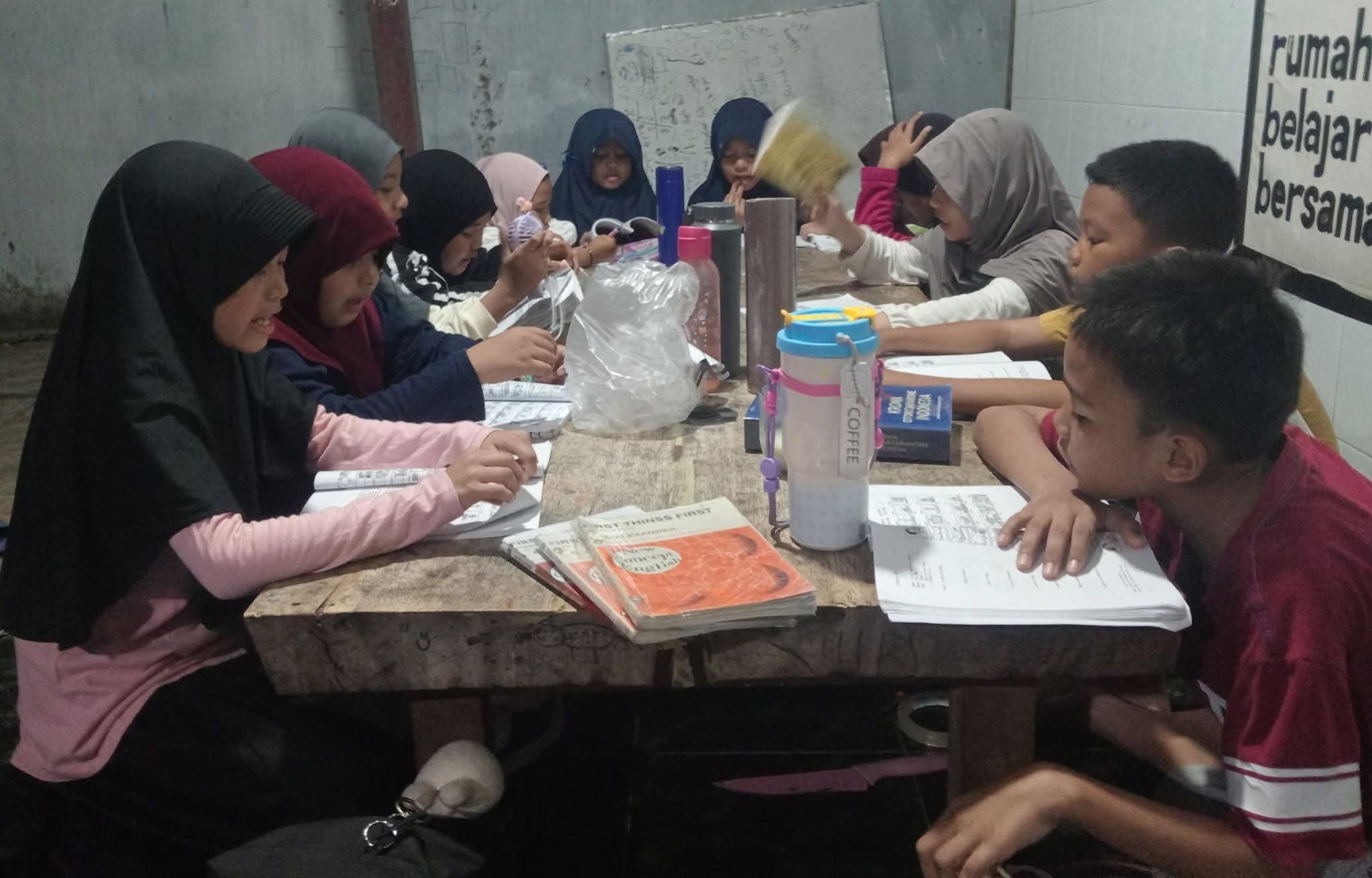 At last, anak anak pada foto ini adalah pelajar Bahasa Inggris di malam hari. Pada sore hari.hingga jelang Maghrib, mereka lebih banyak menghabiskan waktu untuk mengaji. Banyak diantara mereka juga mengambil dua kelas mengikuti kelas Matematika dengan cara belajar secara selang seling. Jadwal memang padat dan terkesan melelahkan, seolah merampas dunia bermain anak. Untuk mengatasi masalah tersebut, kita menjadikan belajar dengan suasana bermain. Membaca buku sering dilakukan secara bersama-sama terkesan seru dan riuh. Mereka juga punya banyak tawaran ide semisal membuat kelompok untuk menyelesaikan suatu masalah dan berakting dalam menyampaikan satu gagasan dari tugas yang diberikan. Cara belajar yang mereka usulkan itu seringkali diterima oleh guru-guru kelas yang menjadikannya merasa dihargai. Suasana hatinya senang dan tak jarang diikuti suara bersorak ria, hore. Pada intinya, mereka menemukan cara belajar yang membuatnya bahagia.